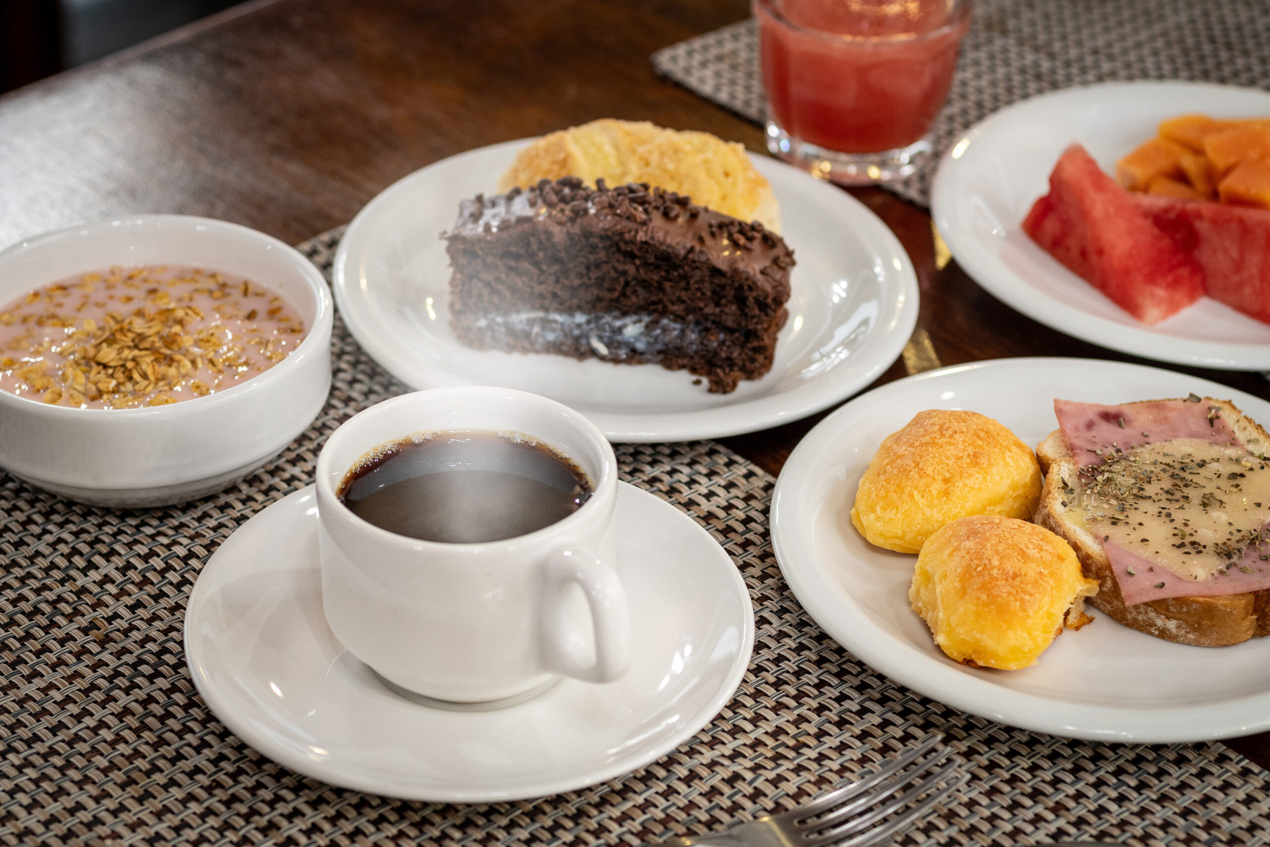 Servido no restaurante amplo e acolhedor, nosso café da manhã conta com uma ampla seleção de itens, incluindo uma variedade de pães, bolos caseiros, frutas, frios, ovos mexidos e assados, cereais, iogurtes, sucos naturais e bebidas quentes como café, leite e chás.